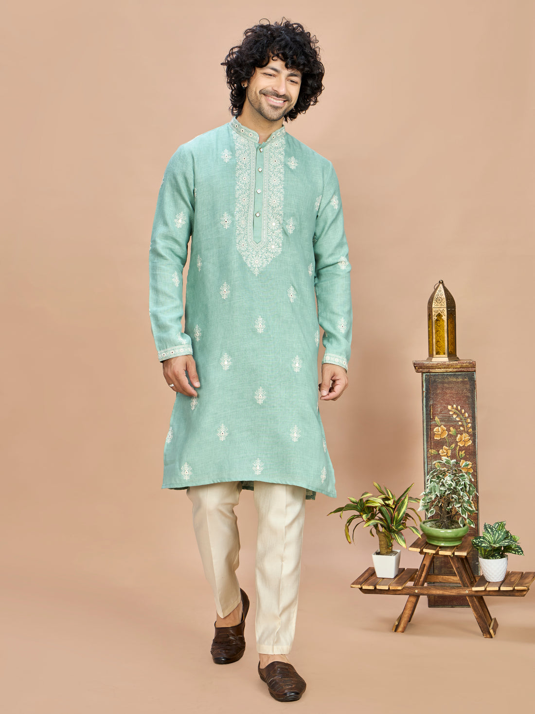 Light Pista Linen Embroidered Kurta Set for Men