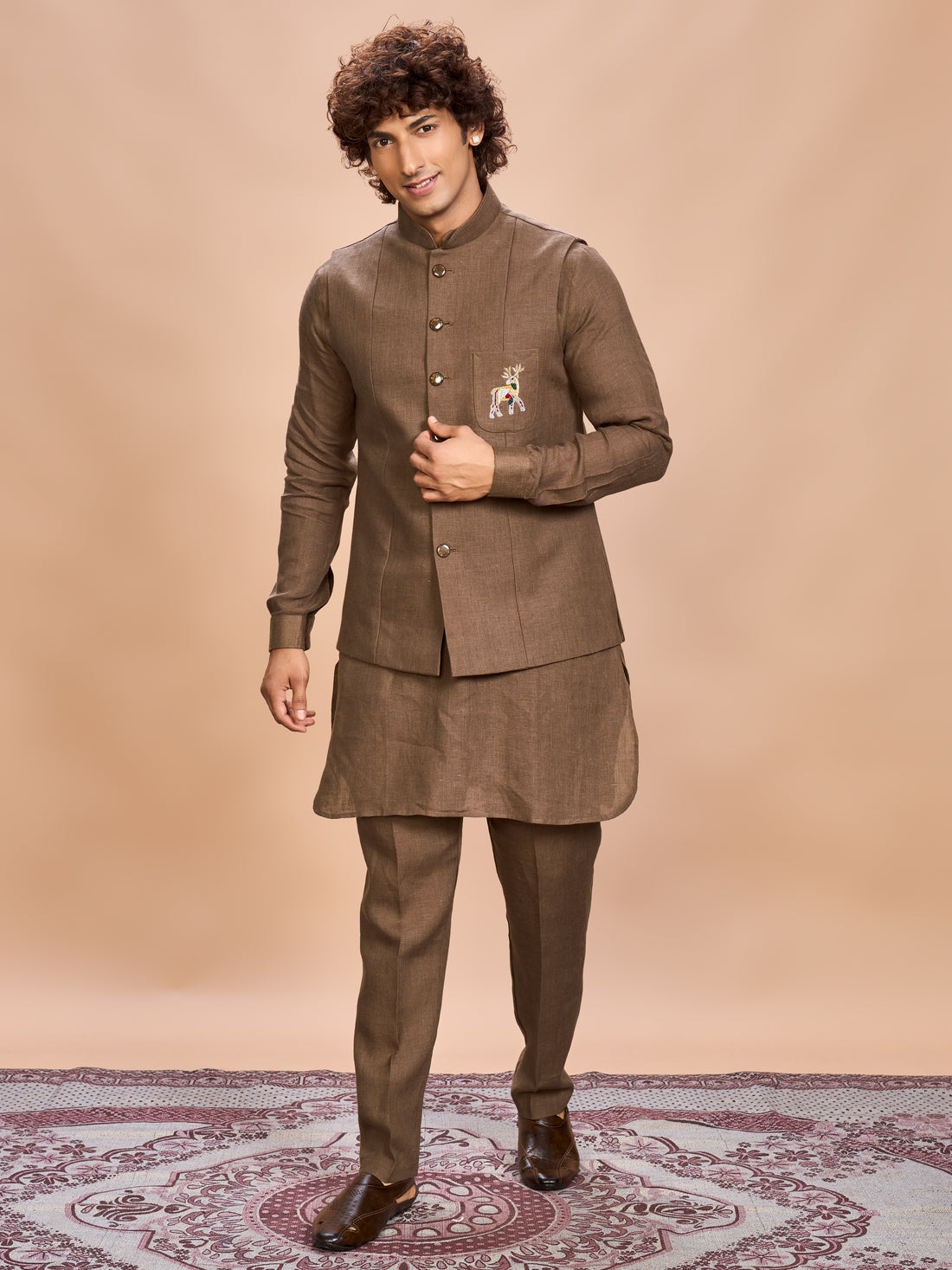 Brown Linen Jacket Kurta Set for Men