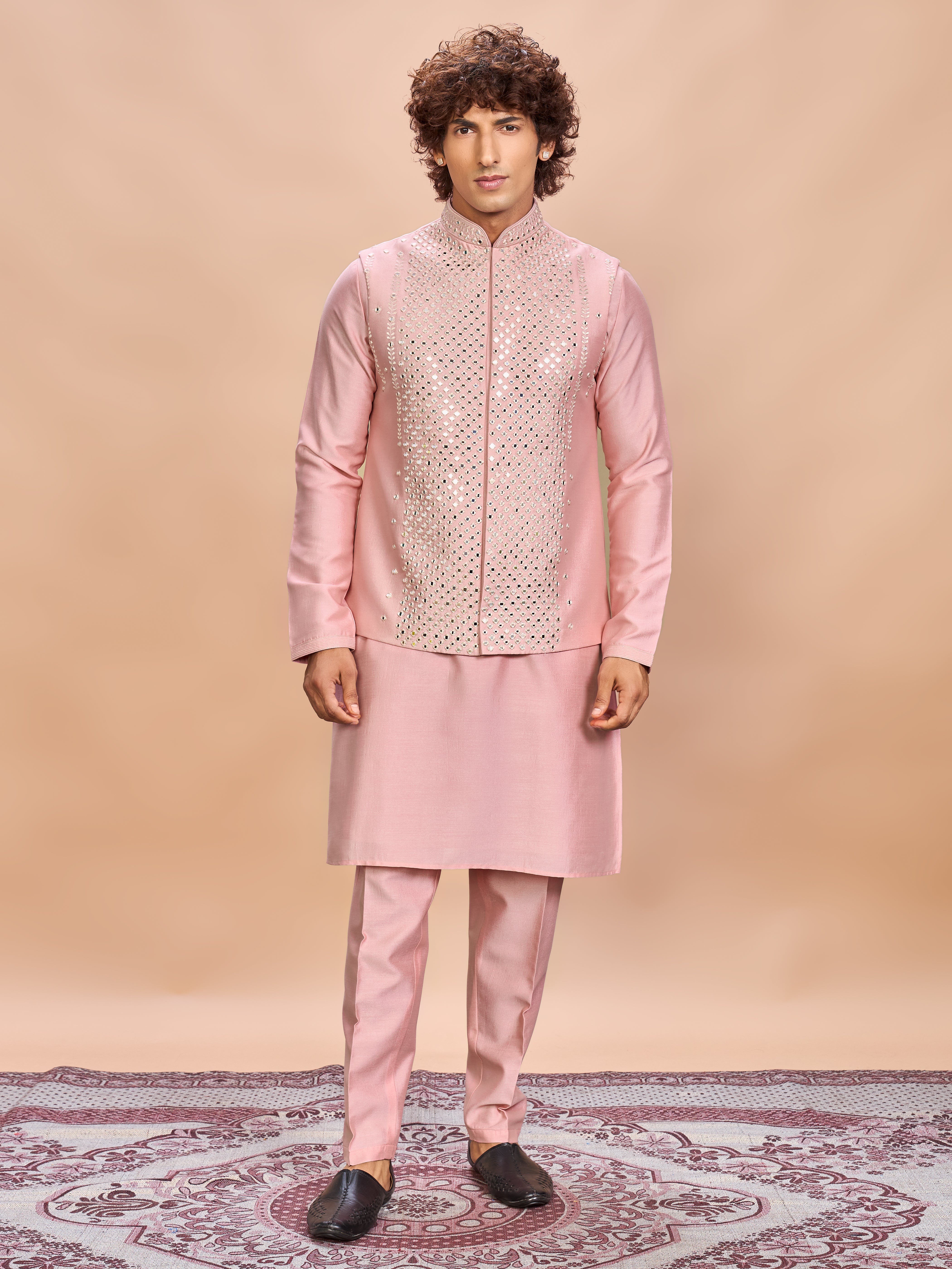 Understated yet grand — this pink silk jacket kurta set redefines contemporary wedding style for the modern man.