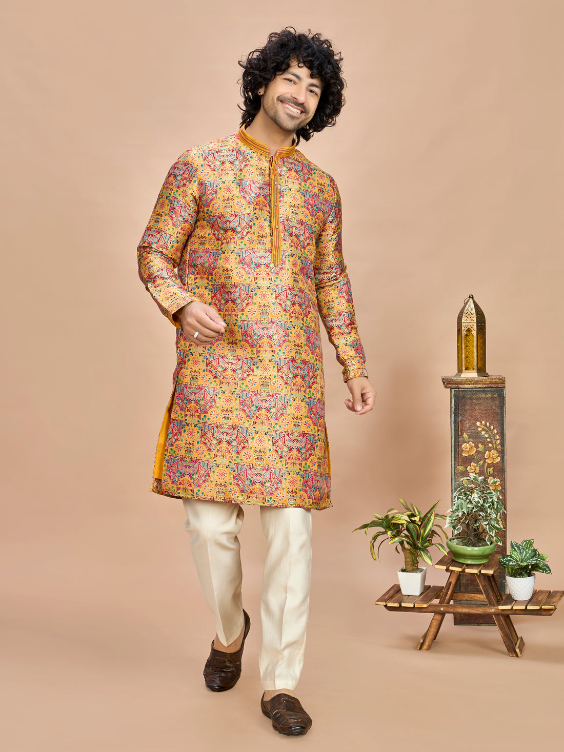 Add vibrance to your ethnic wardrobe with our Mustard Multicolor Kurta, crafted for those who...