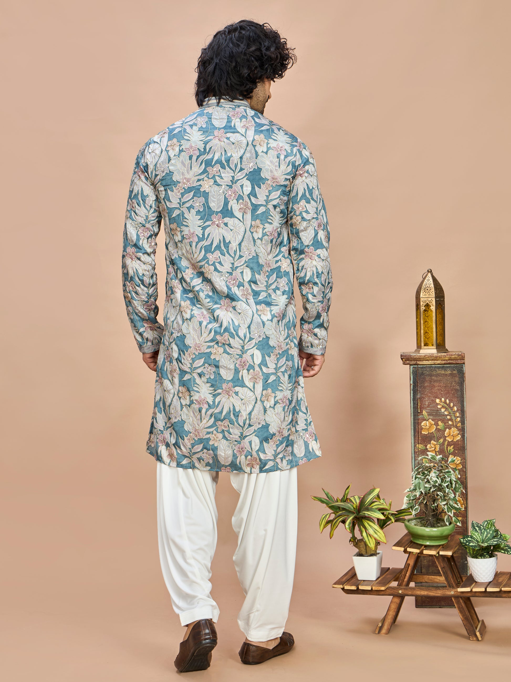 Refresh your ethnic collection with our Aqua Floral Kurta, a perfect blend of elegance and modern sophistication. The soothing aqua base is beautifully highlighted with pastel floral embroidery in shades of cream, pink, and beige, creating a refined festive look. Ideal for weddings, receptions, and cultural gatherings, this kurta ensures comfort while making a subtle yet striking impression.