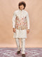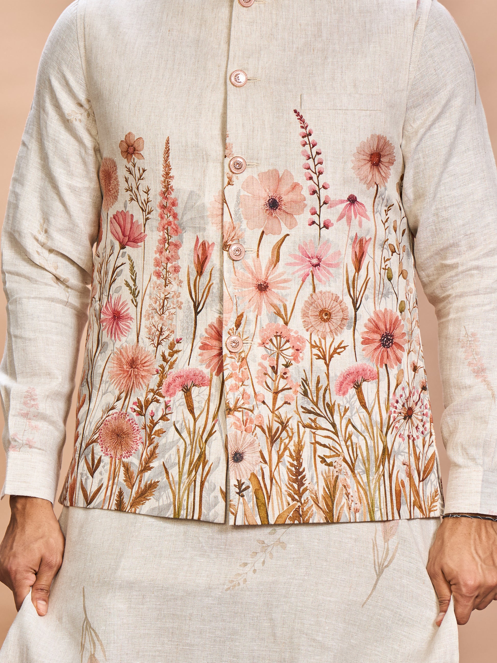 Embrace refined elegance with this Beige & Floral Pink Linen Jacket Kurta Set, crafted for men who appreciate understated luxury. The soft floral print in blush pink tones brings a fresh, artistic touch to your traditional wardrobe — perfect for sangeet, engagement, or wedding festivities.