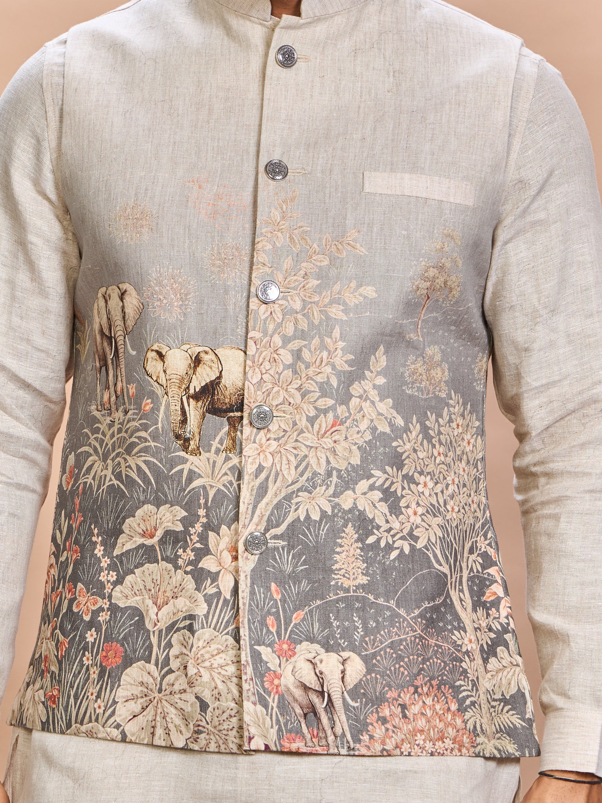 Make a refined statement with this Grey Linen Jacket Kurta Set, a sophisticated blend of subtle color and intricate printed detailing. The scenic print featuring nature-inspired motifs adds a creative, regal touch, perfect for sangeet, wedding receptions, or festive evenings.