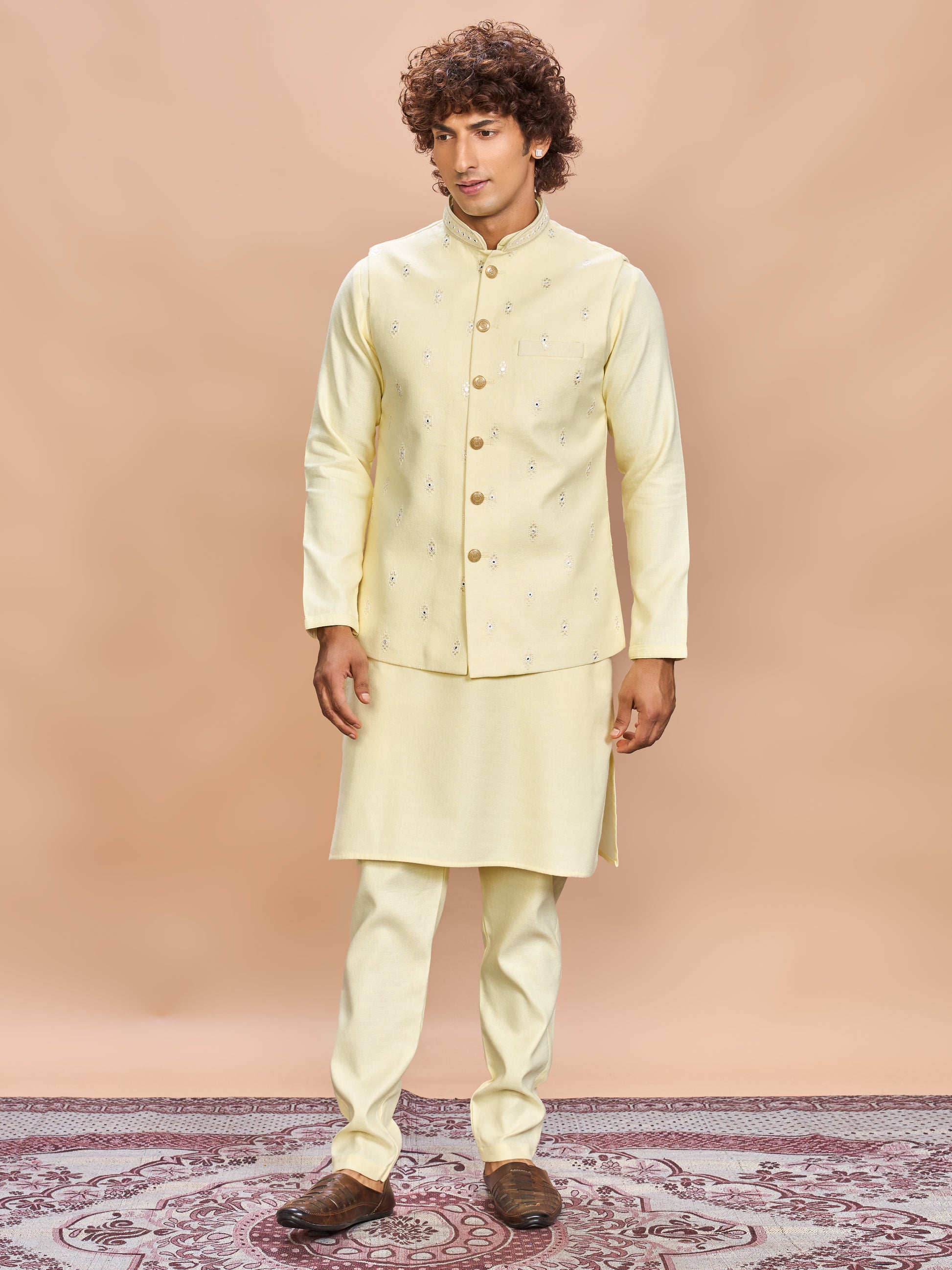 Light, elegant, and timeless — this light yellow linen kurta set is your perfect festive essential.