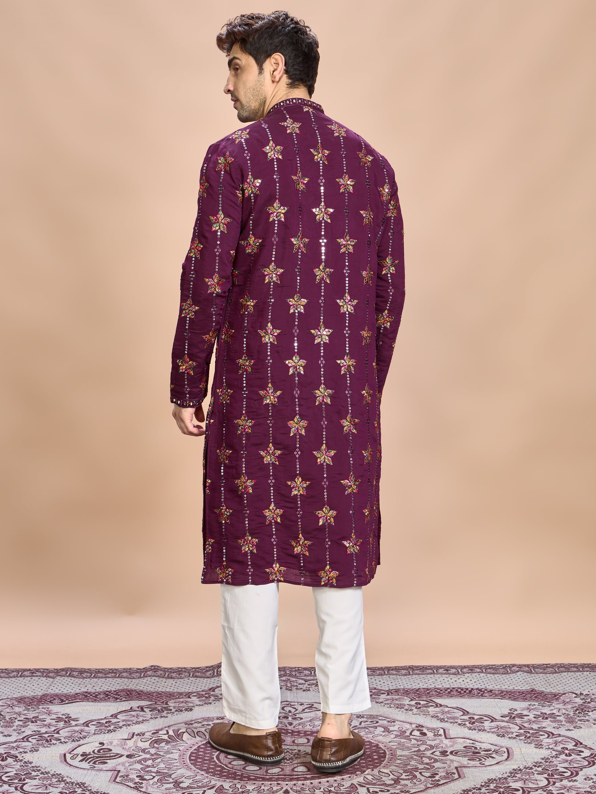 Step into every occasion with confidence and grace — this wine silk embroidered kurta set defines luxurious festive style.