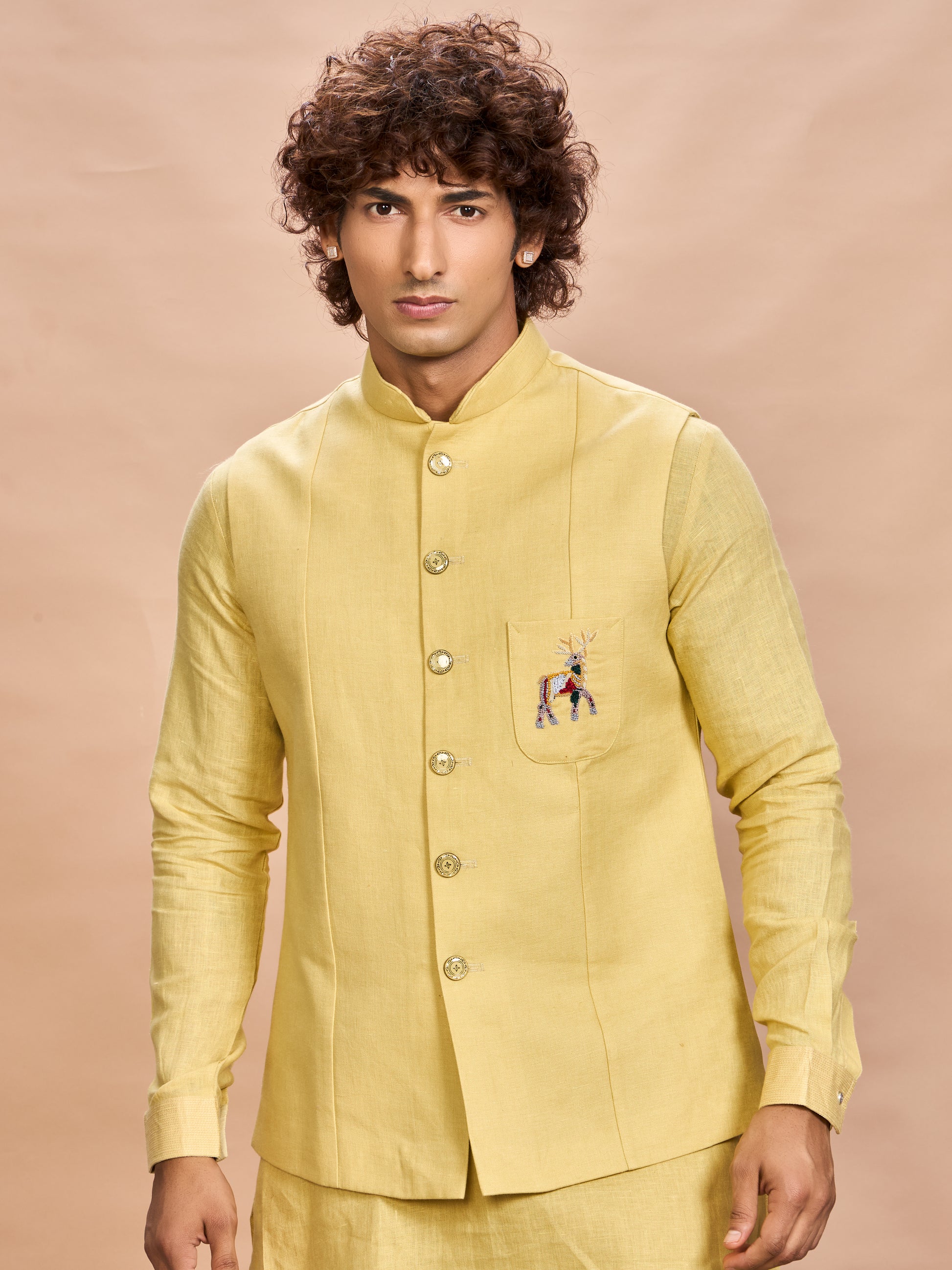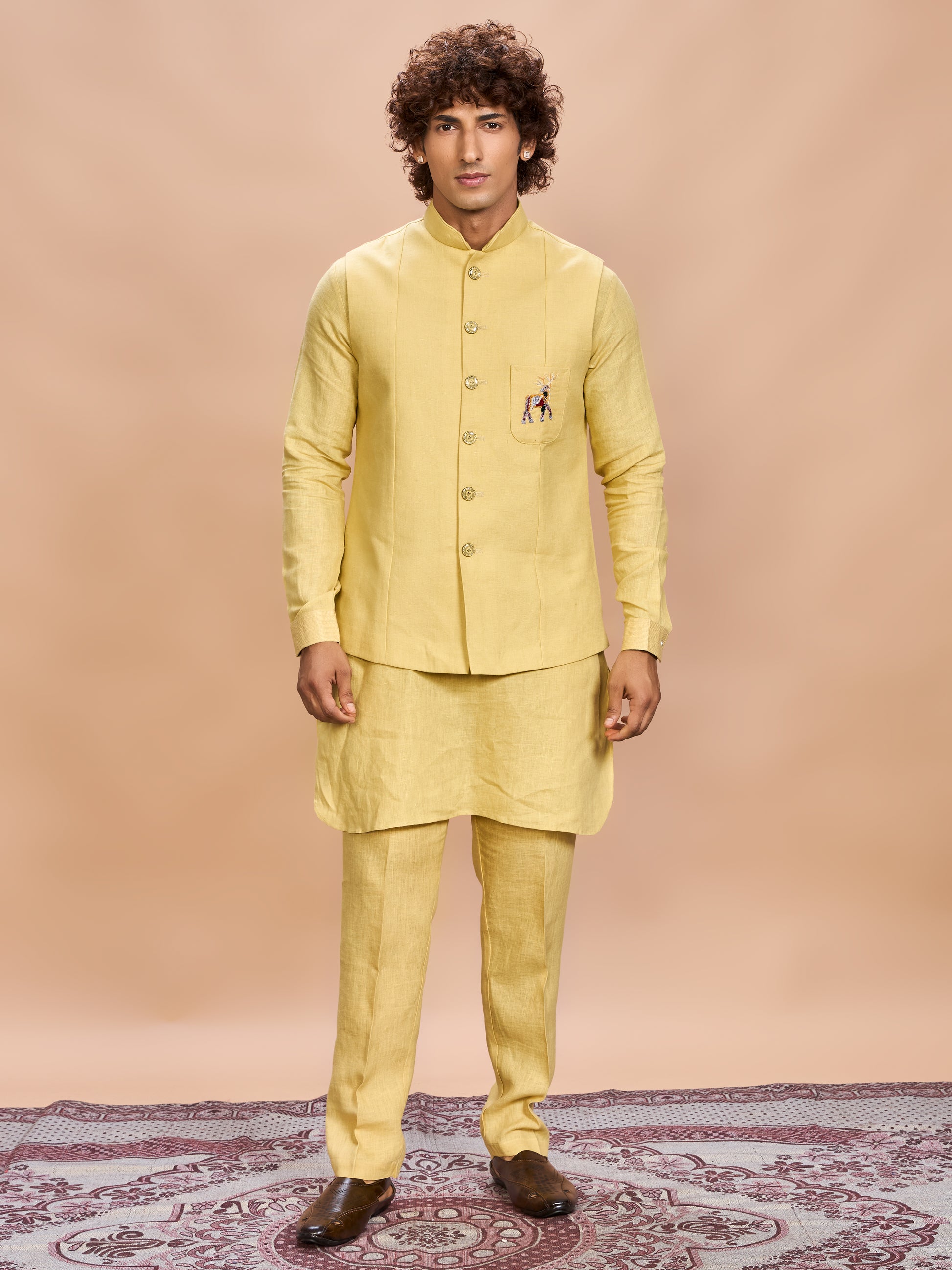 Sunlit style with effortless sophistication—this yellow linen jacket kurta set is your go-to for festive elegance.